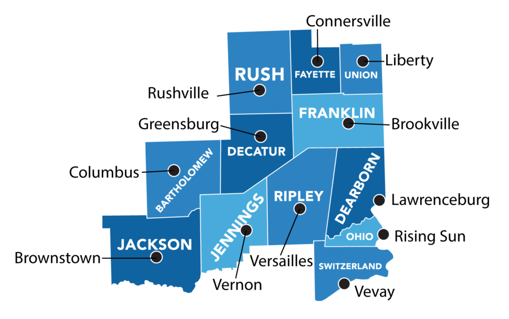 Situated between three major population centers (Indianapolis, Cincinnati, and Louisville), Southeast Indiana is home to significant corporate interests in cities and towns like Columbus, Greensburg, and Batesville. For purposes of the Indiana GPS Project, Southeast Indiana includes Fayette, Union, Bartholomew, Decatur, Franklin, Jackson, Jennings, Ripley, Dearborn, Ohio, and Switzerland Counties.